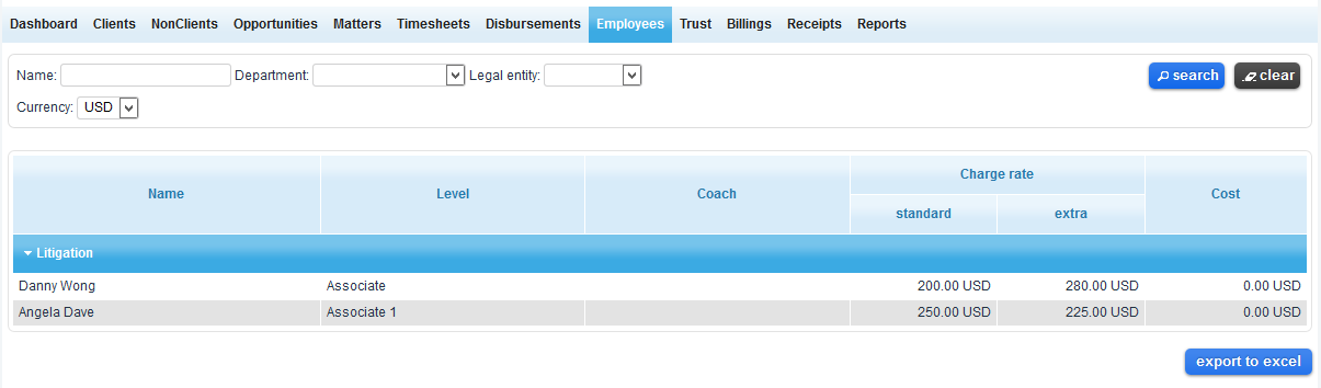 On the Fee Earners' menu users will see a table listing all the departments within their organization. To see the employees within each department, click on the department name to expand the field.