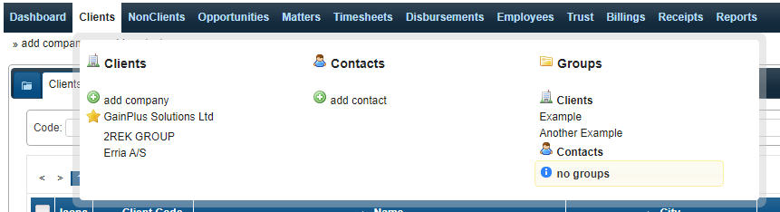 The Clients screen can be accessed from any screen within TaBS by clicking on the word Clients in the menu bar. Alternatively, you can hover your cursor over the word Clients to reveal a display window containing categories which are labeled Clients, Contacts, and Groups. If you click on any of the category headings, it will take you directly to that area of the Clients menu.