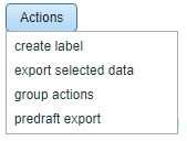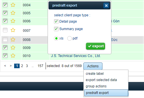 that corresponds with the entry. Once you have selected the entries that you would like to export, click the actions button and then select predraft export. A pop-up window will display allowing you to choose whether you would like to include a detail and/or summary page of the client information, and also whether you would like the information in pdf or xls format. After you have made your selections, choose export to complete the process.