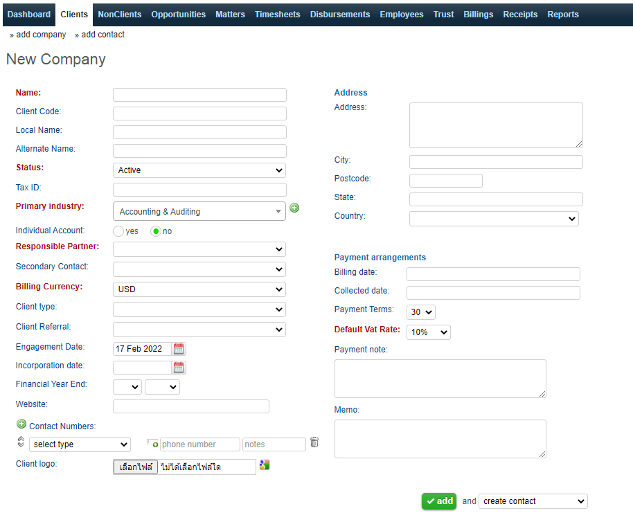 Once at the new company screen, fill in the fields highlighted in red along with any additional fields that you would like to include. Once you have completed this, press the add button to finalize the process.
