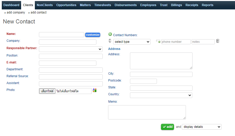 At the new contact screen, fill in the fields highlighted in red along with any additional fields that you would like to include. Once you have completed this, press the add button to finalize the process.