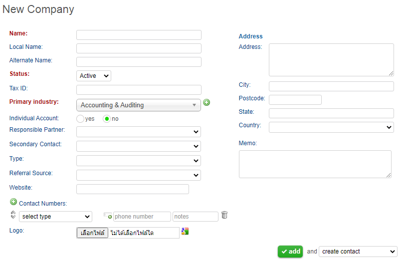 Once you have reached the New Company screen, input the company details into the fields (fields in red are required) and then press the green add icon located at the bottom of the screen to save the information.