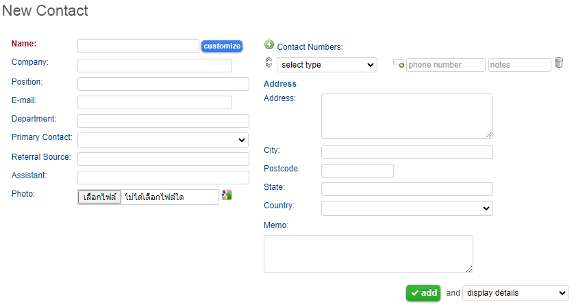 Once you have reached the New Contact screen, input the contact details into the fields (fields in red are required) and then press the green add icon located at the bottom of the screen to save the information.