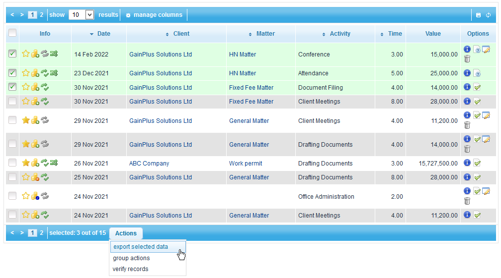 To export a time sheet into Excel, select the Timesheets menu and then scroll to the Timesheet list on the bottom half of the page. From the Timesheet list, tick the boxes corresponding with the entries you would like to export. Once all of the entries have been ticked, select the actions button and then choose export from the drop-down menu.