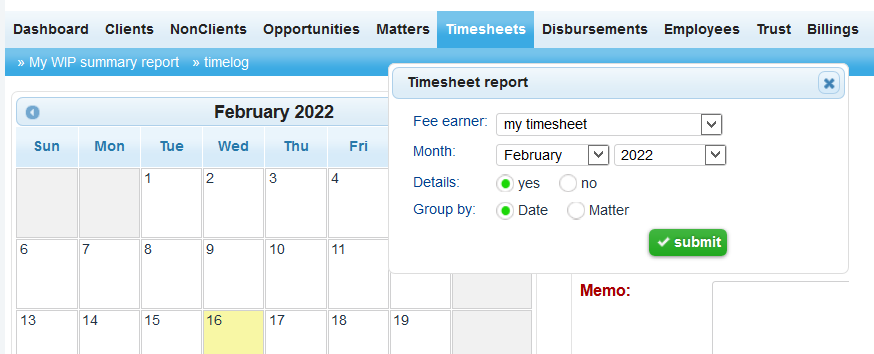 To view a time sheet report in PDF format, select the Timesheets menu and then “My WIP summary report” from the menu bar. Next, select from the pop-up window the fee earner, month, year, whether or not to include details, and if you would like to group by date or matter. Click the submit button to generate a time sheet report that includes a calendar view of the time logs for the month, along with the corresponding time sheet entries. Unlike the option to export a time sheet into Excel, only a single fee earners time sheet can be exported into a PDF report; multiple fee earners can not be exported to the same PDF report.