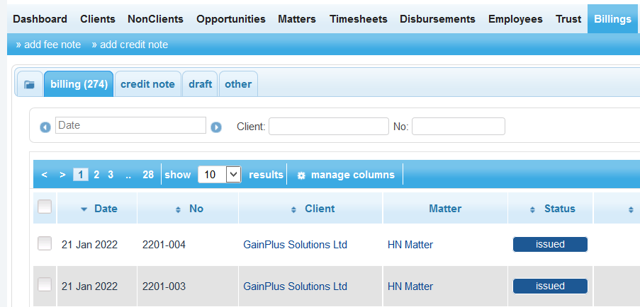 Within the Billings menu, most of the menu's features can be found on the sub-menu and the billings list. The sub-menu provides access to the main features, including the add billing note, add credit note, and the manage group feature. The billings list provides a quick overview of billings in the system, organized by group categories such as billing, draft, and credit note.