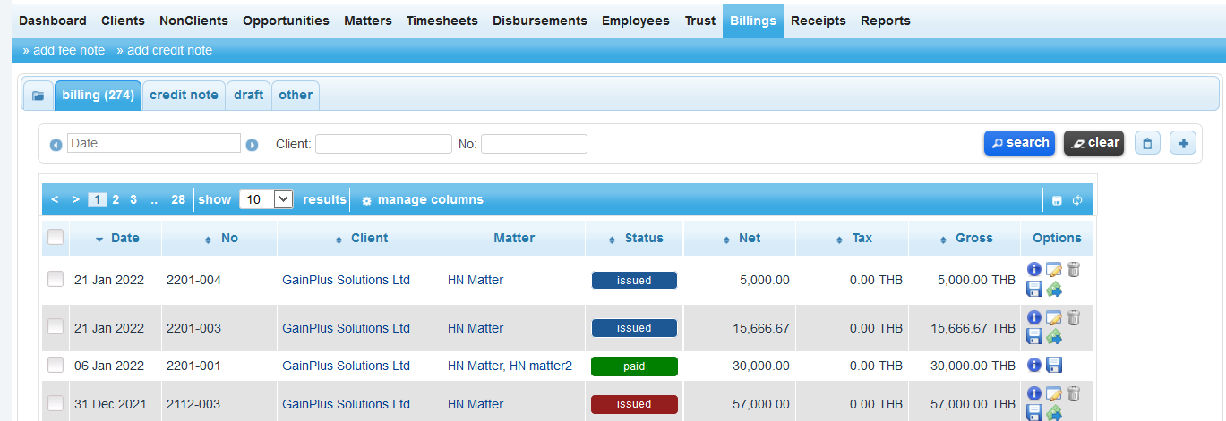 Along the top of the Billings List users will find four dedicated Tabs. These tabs are: billing, other, draft, and credit note. In addition, users will also see tabs for any groups they have formed and chosen to create a tab for.
