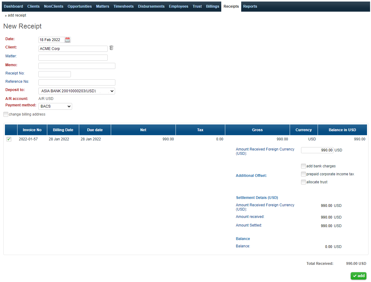 If Trust module is enabled and client does have trust fund balance available, system will allow to offset outstanding invoice amount with trust funds.