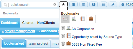 Located next to the quick search field users will see the Bookmarks icon, represented as a star. Placing your mouse over the icon will reveal a list of all the companies that have been bookmarked. To view the bookmarked entry, select it by clicking on it. If you would like to delete a bookmarked entry select the red x icon located next to the entry.