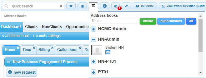 The "online", "subordinates" and "all" buttons allow the user to toggle between displaying different groups of users in the address book.