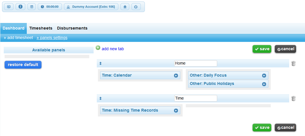 After clicking on the panel settings, users will see a screen listing available panels, an option to add new tabs, as well as their current tab and panel configuration.