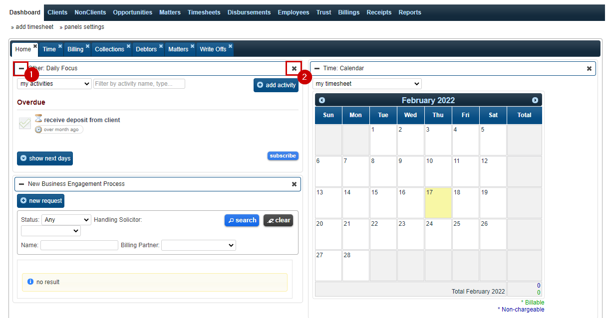 Regardless of the position of the tab or the panels within it, the operation of each tab and panel from the dashboard is the same.