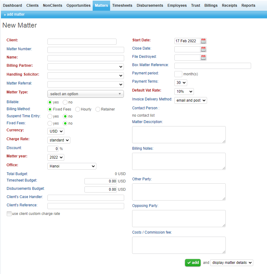 The second way to add a matter is to click on the word Matters in the menu bar. After clicking you will see the words “add matter” in the sub-menu bar. Clicking on that will take you to the add new matter screen.