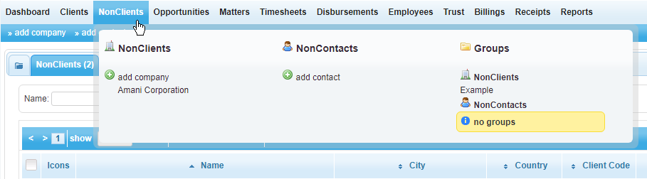 To access the features of the NonClients menu, hover your cursor over the word NonClients in the menu bar. This will reveal a pop-up window with three categories: NonClients, NonContacts, and Groups.
