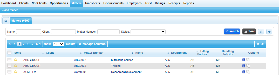 The Matters list is a comprehensive listing of the matters which are available for you to view. It can be found at the top of the Matters menu page, directly below the sub-menu bar. Within the matters list users will find a search bar that can be used to filter the list and also any groups that have been created.
