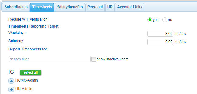 This will direct you to a more detailed version of your profile from where you can select the Timesheets tab located in the lower portion of the screen. Within the tab you will see a heading titled “Report Timesheets for.” Below the heading is a list of your organizations users grouped by entity and department. You can expand this column to select individual users from a specific list, or you can select all of the users within a department or entity by hovering your mouse over the desired choice and clicking “select all” when it is revealed. Alternatively, you can search for a specific user by entering their name in the search filter. To finish, save your selection.
