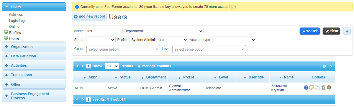 To begin, select the settings icon from the quick search tool bar. When prompted, enter your password to gain access to the settings menu. Expand the Users button and then select the word Users from the list of options, being careful not to click on the green add users button. Next, click on the edit button located next to the profile you would like to modify.