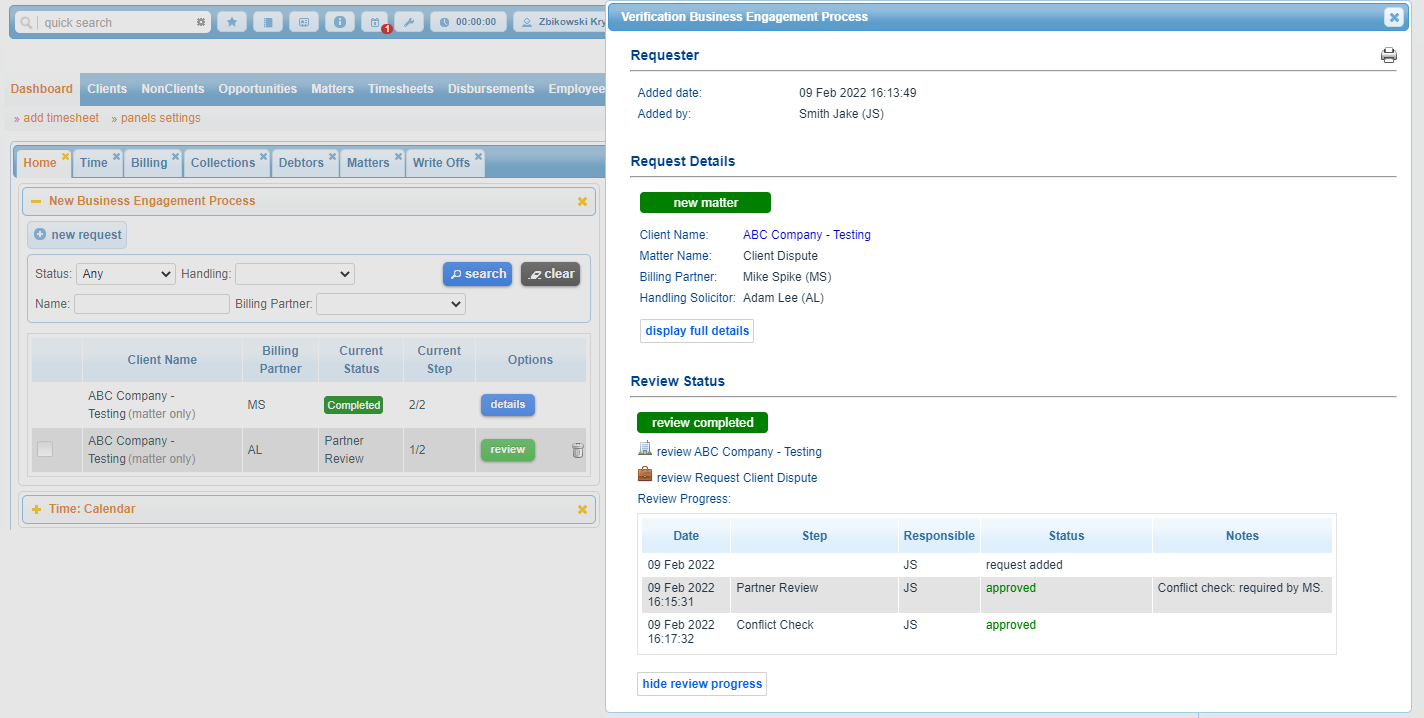 Instead, TaBS provide request & approval process to manage new client & matter take on.